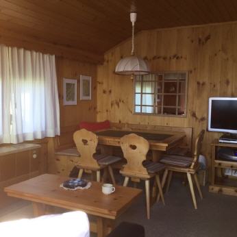 Das Wohnzimmer hat Ess- und Salontisch und ein schönes Buffet.